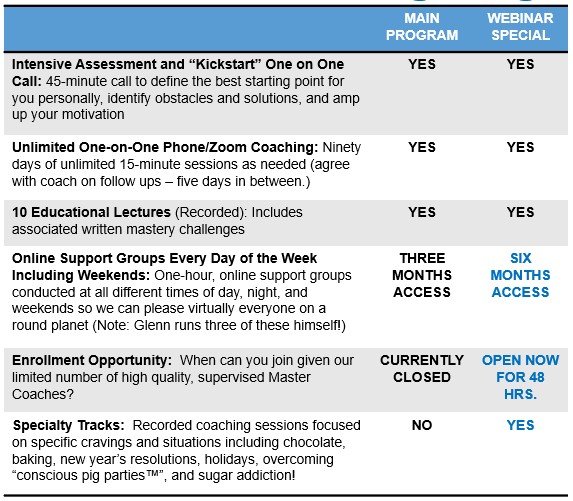 The Defeat Your Cravings (Download the Cheat Sheet discussed during the event here) OFFER HAS EXPIRED "Thank you" is something not said often enough these days, but I really do appreciate your willingness to trust me with your time in the Webinar today! If you'd like to book your spot in the program right away, you can do that from this page (only) until Thursday, 8/8/24 at 12 pm Eastern Time, and only while sufficient spots remain! The program was described in detail during the Webinar, but you can also read more detail by clicking this link. HOWEVER, DO NOT ORDER FROM THE DETAILS PAGE WHICH POPS UP! Instead, book your spot from the link below to get all the Special Webinar Bonuses, including immediate access to the program, which is otherwise closed at this time. YOUR PURCHASE TODAY IS PROTECTED BY A 100% MONEY BACK GUARANTEE FOR THIRTY DAYS, NO QUESTIONS ASKED!